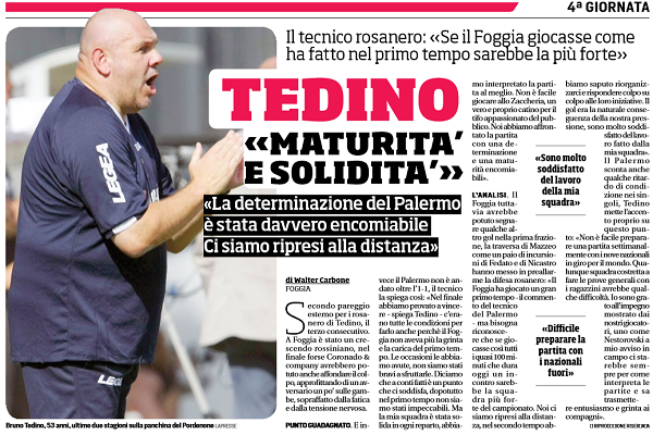 Corriere dello Sport: “Tedino: «Maturità e solidità. La determinazione del Palermo è stata davvero encomiabile. Ci siamo ripresi alla distanza»”