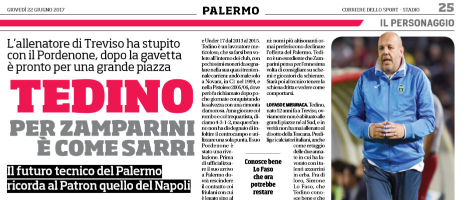 “Con una di quelle iperboli che tanto spesso hanno fatto sorridere se non arrabbiare mondo del calcio e tifosi, Zamparini lo ha definito il nuovo Sarri. Un modo per dire che Bruno Tedino viene dalla gavetta e dalle categorie minori, dove però il suo lo ha sempre fatto tanto da meritarsi la chiamata delle nazionali azzurre giovanili, con Sacchi che gli affidò la guida dell’Italia Under 16 e Under 17 dal 2013 al 2015. Tedino è un lavoratore meticoloso, che sa farsi ben volere all’interno dei club, con pochissimi esoneri da segnalare nella sua quasi trentennale carriera: andò male solo a Novara, in C1 nel 1999, e nella Pistoiese 2005/06, dove però fu richiamato dopo poche giornate conquistando la salvezza con una rimonta clamorosa. Ama giocare col rombo e col trequartista, diciamo 4-3-1-2, ma quest’anno non ha disdegnato di infoltire il centrocampo e utilizzare una sola punta. Il suo Pordenone è stato una rivelazione. Prima di ufficializzare il suo arrivo a Palermo dovrà rescindere il contratto coi friulani con cui è legato sino al 2019. UOMO DI ZAMPARINI. La conoscenza col patron rosanero è di antica data. Tedino ha allenato le giovanili del Venezia di Zamparini dal 1995 al ’97. Pordenone è a due passi da casa del presidente (o ex, fate voi) e molti ricorderanno che proprio questo club è stato il primo rilevato da Zamparini prima di approdare in Laguna. Tedino è stato seguito con attenzione in questo periodo e inoltre le sue caratteristiche sono perfette per il momento vissuto dal Palermo e da Zamparini: nomi più altisonanti ormai preferiscono declinare l’offerta del Palermo. Tedino è un esordiente che Zamparini pensa per l’ennesima volta di consigliare su schemi e giocatori da schierare. Starà poi al tecnico tenere la schiena dritta e vedere come comportarsi. LO FASO E MISURACA. Tedino, nato 52 anni fa a Treviso, ovviamente non è abituato alle grandi piazze né al Sud, e in verità non ha mai allenato al di sotto della Toscana. Predilige i calciatori italiani, anche come retaggio delle due annate in cui ha lavorato con i talenti azzurrini in erba. Fra di loro, Simone Lo Faso, che Tedino conosce bene e che con la sua presenza potrebbe trovare un motivo in più per restare. Quanto agli ex palermitani, Bruno ha allenato quest’anno Gianvito Misuraca, che fu capitano della Primavera rosanero divenuta campione d’Italia nel 2009 ma che in prima squadra non ebbe mai un’occasione. Il primo acquisto intanto sembra scontato: Tedino porterà con sé a Palermo il promettente centrale difensivo Andrea Ingegneri, 25 anni, uno dei pilastri del suo Pordenone”. Questo quanto riportato da “Il Corriere dello Sport”.