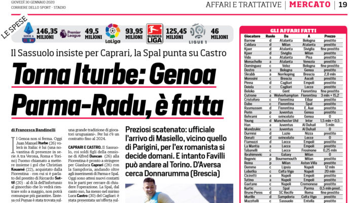 L’edizione odierna del “Corriere dello Sport” fa il punto anche per quanto riguarda il mercato di serie A. Il Genoa non si ferma. Oggi Juan Manuel Iturbe (26) volerà in Italia: è lui (una novantina di presenze in serie A tra Verona, Roma e Torino) l’uomo chiamato a mettere insieme i gol che Christian Kouamé (22), acquistato dalla Fiorentina – con cui si è parlato del prestito di Riccardo Sottil (20) – al di là dell’infortunio al ginocchio che lo vedrà rientrare solo a maggio, non potrà comunque più garantire. L’intesa col Pumas è stata trovata sulla base di un prestito con diritto di riscatto fi ssato a 4 milioni di euro. Le visite mediche sono in programma domani, nell’ultimo atto di questa sessione di trattative. Nel giorno dell’uffi cialità del trasferimento di Andrea Masiello (33) dall’Atalanta e delle visite mediche di Iago Falque (30) preso dal Torino in prestito con diritto di riscatto fi ssato a 8 milioni, restano da limare alcuni dettagli per Vittorio Parigini (23). Ha già sostenuto le visite mediche, ma manca ancora l’intesa defi nitiva col club granata. Si è poi registrata la fumata bianca per Adama Soumaoro (27), capitano del Lille. In uscita, El Yamiq (27), va in prestito al real Saragozza per i prossimi 6 mesi. Il Cagliari, dopo che l’operazione legata al trasferimento di Marko Pjaca (24) dalla Juventus è saltata – il giocatore potrebbe rientrare nel mirino della Samp – si coccola Gaston Pereiro (24), il trequartista all’occorrenza attaccante esterno, che non appena atterrato ha subito rilanciato: «Sono arrivato in un club con una grande tradizione di giocatori uruguaiani». Per lui c’è un contratto fi no al 2024.