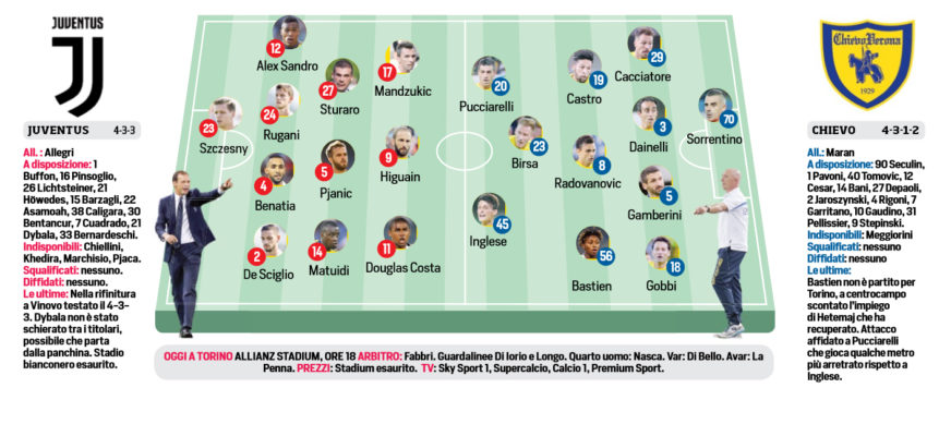 Corriere dello Sport: “Torna la serie A. Le probabili formazioni di Juventus-Chievo”
