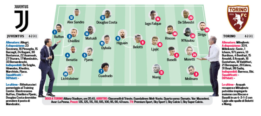 Match dalle mille emozioni quello che andrà in scena questa sera alle 20.45 all’Allianz Stadium tra Juventus e Torino. Le due squadre si affronteranno in campionato in occasione della 6^ giornata del campionato di serie A. Ecco in alto la foto con le probabili formazioni de “Il Corriere dello Sport”.