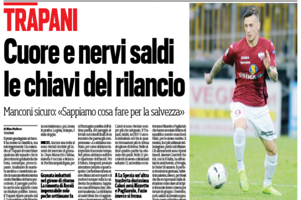 Ancora una volta si sono rivelati decisivi gli innesti del mercato di gennaio. Dopo Maracchi e Jallow, stavolta è toccato a Manconi. Pochi scampoli di gara, per lui, e un gol, frutto di una bella triangolazione con Coronado. «Ci siamo trovati subito molto bene e la sintonia ha funzionato – spiega l’ex attaccante della Reggiana -. Per quanto mi riguarda, mi sono tuffato nella partita, mi sono mosso tanto e ho dialogato coi compagni. Magari sarò minuto, fisicamente, però provo a far valere altre qualità». È Manconi l’immagine positiva dell’ultima partita, del pareggio afferrato nei minuti finali di un incontro che pareva già compromesso: «Lo abbiamo meritato, per come abbiamo interpretato il secondo tempo. Nel primo abbiamo sofferto le ripartenze dell’Ascoli. Per il futuro, bisognerà prestare attenzione proprio a quest’aspetto. Cercheremo di non essere distaccati nei reparti e di metterci sempre tutta la cattiveria che possiamo. Sappiamo cosa dobbiamo fare, ottenere la salvezza. La dobbiamo ai nostri tifosi che ci raggiungono e ci sostengono anche in trasferte così faticose». Insomma, il bicchiere è mezzo pieno. Resta qualche dubbio sul modulo di partenza (3-5-2) e sul fatto che Coronado, tra i più in forma del campionato, non sia stato schierato fra i titolari. Ma, a bocce ferme, poco importa, anche perché, in questa seconda parte di stagione, le soluzioni proposte da Calori si sono rivelate sempre più che adeguate. Il Trapani, infatti, nel 2017 è ancora imbattuto ed è fra le quattro formazioni più in forma del girone di ritorno. Nelle ultime quattro partite ha ottenuto otto punti. Nelle 21 precedenti ne aveva collezionati soltanto 13, un bottino eccessivamente magro che ha spinto a pensare che i siciliani fossero già spacciati e destinati a un’inesorabile retrocessione. La media di due punti a partita, invece, rilancia le ambizioni di salvezza di una squadra che, adesso, è attesa dalla trasferta di La Spezia. È la seconda consecutiva e non sarà per niente semplice da affrontare. Per l’occasione, rientreranno Nizzetto e Pagliarulo che hanno scontato il turno di squalifica mentre mancherà Fazio, per lo stesso motivo. Il terzino, fra i più utilizzati della stagione, potrà così rifiatare. Gli allenamenti sono ripresi lunedì. Assente Guerrieri che ieri, con la B Italia, ha affrontato in amichevole, a Perugia, la Under 20 azzurra. Il portiere rientrerà in giornata. Attività in palestra, invece, per Rossi che sta recuperando dalla distrazione muscolare al bicipite femorale destro e lavora per tornare in gruppo. Dovrebbe, però, saltare la prossima gara. Al suo posto potrebbe essere confermato Colombatto. È rientrato a pieno ritmo Daì, che ha smaltito la borsite achillea che lo aveva tenuto ai box le scorse settimane. Al ritmo di due sedute di allenamento al giorno il Trapani si prepara alla trasferta in terra ligure. La rifinitura che anticiperà la partenza per La Spezia è in programma venerdì alle ore 10.30“. Questo quanto riporta l’edizione odierna de “Il Corriere dello Sport”.