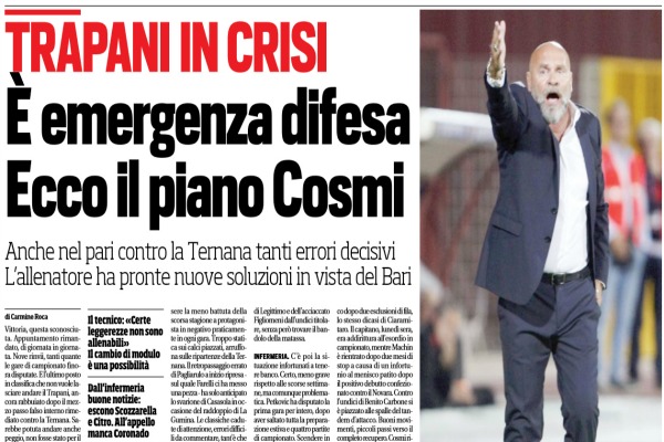 sere la meno battuta della scorsa stagione a protagonista in negativo praticamente in ogni gara. Troppo statica sui calci piazzati, arruffona sulle ripartenze della Ternana. Il retropassaggio errato di Pagliarulo a inizio ripresa – sul quale Farelli ci ha messo una pezza – ha solo anticipato lo svarione di Casasola in occasione del raddoppio di La Gumina. Le classiche cadute di attenzione, errori difficili da commentare, tant’è che neanche Cosmi, nel post-gara, è riuscito a spiegarne i motivi. Il problema è serio. Variano gli interpreti, ma il risultato non cambia. Dodici reti subite in nove turni. Numeri negativi, impietosi. Finora solo i reparti difensivi di Pro Vercelli e Latina, con quattordici marcature incassate, hanno fatto peggio. Il tecnico umbro ha provato anche a modificare l’assetto, indietreggiando Fazio di qualche metro, affiancando Casasola a Pagliarulo, con le esclusioni di Legittimo e dell’acciaccato Figliomeni dall’undici titolare, senza però trovare il bandolo della matassa. infermeria. C’è poi la situazione infortunati a tenere banco. Certo, meno grave rispetto alle scorse settimane, ma comunque problematica. Petkovic ha disputato la prima gara per intero, dopo aver saltato tutta la preparazione estiva e quattro partite di campionato. Scendere in campo con una certa regolarità è il punto di partenza per il croato, tra i più vivaci contro la Ternana. Citro è ancora alle prese con gli strascichi di una fastidiosa pubalgia. Lunedì sera ha provato a mettere in mostra qualche lampo della sua qualità, più volte ammirata la passata stagione – tanto da richiamare l’attenzione di club di Serie A e Serie B – ma soltanto intravista in questo avvio di stagione. Scozzarella ha ripreso confidenza con il rettangolo di gioco dopo due esclusioni di fila, lo stesso dicasi di Ciaramitaro. Il capitano, lunedì sera, era addirittura all’esordio in campionato, mentre Machin è rientrato dopo due mesi di stop a causa di un infortunio al menisco patito dopo il positivo debutto confezionato contro il Novara. Contro l’undici di Benito Carbone si è piazzato alle spalle del tandem d’attacco. Buoni movimenti, piccoli passi verso il completo recupero. Cosmi riparte da qui – aspettando Coronado – in vista della trasferta di Bari. Lo stesso allenatore ha ricordato a stampa e tifosi quanto accaduto appena cinque mesi fa, quando il blitz compiuto al San Nicola (12) servì ai granata per chiudere al terzo posto in classifica, risultato incredibile per la compagine siciliana. Corsi e ricorsi storici. Il Trapani si aggrappa anche alla cabala per tirarsi fuori dal momento negativo.”. Questo quanto si legge sull’edizione odierna de “Il Corriere dello Sport”.