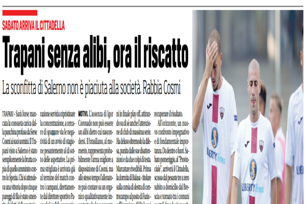 Corriere dello Sport: “Trapani senza alibi, ora il riscatto. Sabato arriva il Cittadella. La sconfitta di Salerno non è piaciuta alla società. Rabbia Cosmi”