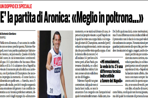 “Nella terra di mezzo, c’è un uomo in conflitto con se stesso: perché questa, Palermo-Napoli, non è una partita qualsiasi per Salvatore Aronica, né può esserla. Questo è il derby del cuore, in cui si mescolano i sentimenti: di qua c’è il «picciotto» che ha casa a Mondello; e di là c’è il calciatore che a Napoli ha vissuto il momento più alto della sua carriera, con il profumo di Champions che ancora impregna la memoria. «E come faccio a dimenticare quelle sere…». Stavolta, non c’è posto allo stadio, perché è meglio negarsela una emozione del genere: è un conflitto intestino a cui Aronica preferisce sottrarsi, distratto com’è dagli impegni da «allenatore» che sarà («sto finendo il Supercorso») e dalle contorsioni a cui una gara del genere lo costringerebbe. Rientrerà da Firenze all’ultimo momento, se ne starà sul divano di casa, ripenserà al proprio vissuto: a quel Napoli con il quale ha vinto una coppa Italia e si è regalato gli ottavi di Champions, uscendo (però) soltanto ai supplementari, contro una squadra che poi avrebbe vinto quella coppa. «E noi le demmo filo da torcere: 3-1 all’andata e 3-1 per loro al ritorno; però, al San Paolo, potevamo chiuderla, se a dieci minuti dalla fine Ashley Cole non avesse salvato sulla linea un tiro di Maggio». Palermo-Napoli è un gran contenitore, dal quale non si lascia fuori nulla, se non le amarezze d’un congedo con Zamparini sul quale è ormai inutile tornare. «Sulla carta, inutile fingere, gli azzurri sono più forti. Hanno qualità, e tanta, pur avendo perso Higuain, che non si sostituisce facilmente. L’arrivo di De Zerbi qualcosa darà, come motivazioni, ma c’è una differenza tecnica indiscutibile ed il pronostico non lo faccio io ma quei valori che andranno in campo». Novanta minuti per guardasi praticamente allo specchio, per rivedere Aronica ieri ed oggi e, magari, anche domani: perché sta per cominciare una nuova carriera, stavolta in panchina, in cui bisognerà portar con sé le proprie esperienze di vita. «Napoli mi ha lasciato tanto affetto, che tocco con mano sempre: ho ancora amici in questa squadra, ce ne sono di vecchi, per così dire, ed anche di nuovi, come Reina, con il quale non ho mai giocato, ma del quale ho misurato di persona la sua autorevolezza. E’ sfida speciale, per me, che mi emozionerebbe: meglio in poltrona».”. Questo quanto si legge sull’edizione odierna de “Il Corriere dello Sport”.