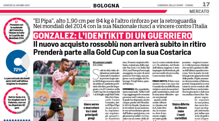 “Scalo in città, visite, destinazione nazionale: Giancarlo Gonzalez è in pectore in giocatore del Bologna ma non salirà da subito a Castelrotto per l’inizio del ritiro, perché impegnato con il Costarica nella Gold Cup che si svolgerà dal 7 al 26 luglio negli Stati Uniti. Ma chi è Giancarlo Castro Gonzalez, detto El Pipo? Pipo sta per piccolo, soprannome regalatogli quand’era bambino e portato con orgoglio anche oggi – il suo account su Twitter e Instagram è pipogonzalez88 – nonostante il suo fisico longilineo proprio piccolo non sia: distribuisce 84 kg per oltre un metro e novanta di statura. 29 anni compiuti a febbraio, costaricano della capitale San José, è in Italia dal 2014, ma l’Europa l’aveva già assaggiata un paio di anni prima in Norvegia, una stagione con la maglia del Valerenga. Poi gli States, quindi Palermo. ESPERIENZA. Ma, soprattutto, tanta nazionale. Nella Gold Cup raggiungerà le sessanta presenze nel Costarica, con il quale ha disputato anche cinque partite del Mondiale 2014 in Brasile. Qualcuno lo ricorderà: la sua nazionale era nel medesimo girone dell’Italia e quel giorno, con gli azzurri sconfitti 1-0, Gonzalez era al centro della difesa a cinque, con Duarte e Umaña accanto. Passarono loro, passò lui. Non manca insomma di esperienza internazionale anche ad alti livelli, e in tre anni in Sicilia ha sommato 82 presenze in A. Destro di piede, ha giocato come centrale nella difesa a 3 e come centrale destro a 4. Da adattato, nel finale dell’ultima stagione è stato impiegato da Bortoluzzi, più per necessità che per scelta, come terzino destro. PREGI E DIFETTI. Il fisico non mente e non è un caso che Gonzalez faccia dell’efficacia nel gioco aereo la sua principale caratteristica, tanto nelle marcature difensive – specie sui piazzati – quanto nelle sortite offensive. Quattro reti in A, tutte di testa, in rosanero, dove il momento migliore è stato quello della sua prima annata italiana, 2014-2015 (il Bologna era in B allora), quando era centrale assieme a Muñoz e Andelkovic. Funzionò, El Pipo venne confermato. Poi però si è trovato invischiato nelle ultime due pessime – stagioni rosanero. I critici possono obiettare che era lui a guidare la difesa dell’ultima squadra retrocessa. Vero in parte: in realtà ha giocato appena la metà delle partite. Di più: nemmeno doveva restare a Palermo, perché Zamparini la scorsa estate lo aveva venduto allo Spartak Mosca, ma la trattativa tra giocatore e club non era andata a buon fine. Stagione segnata: separato in casa prima, due mesi fuori per un doppio infortunio poi, infine una serie di gialli e rossi (rispettivamente 7 e 2). Le ammonizioni frequenti sono un chiaro difetto da limare: il Bologna viene da un’annata negativa, in questo senso, e non può permettere che questa si ripeta”. Questo quanto riportato da “Il Corriere dello Sport”.