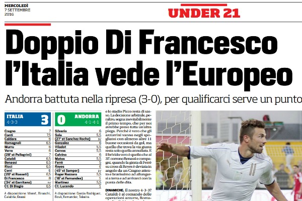 Corriere dello Sport: “Under 21, doppio Di Francesco. L’Italia vede l’Europeo”