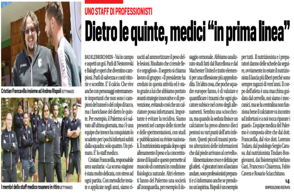 “Vai in campo e aspetti un gol. Parli di Nestorovski e Balogh e speri che diventino campioni. Parli di salvezza e conti vittorie e sconfitte. E’ il calcio. Che vive anche con personaggi estremamente importanti che non sono i campioni del tunnel o del colpo di tacco, ma i fuoriclasse del dietro le quinte. Per esempio, il Palermo si è salvato all’ultima giornata, ma c’è una equipe che invece ha conquistato lo scudetto per i pochi infortuni subiti dalla squadra: solo quattro. Un primato. E’ lo staff medico. Cristian Francavilla, responsabile area sanitaria: «La scorsa stagione è stata molto delicata, con stress ad ogni partita. Con metodiche testate e applicate negli anni, siamo riusciti ad ammortizzare il peso delle lesioni. Risultato che ci rende fieri e orgogliosi». Il segreto si chiama lavoro di gruppo: «Il presidente ha creduto in questa attività ed è stato grazie a lui che abbiamo portato avanti strategie innovative e di prevenzione, evitando così che un calciatore possa infortunarsi. Importante è evitare la recidiva. Siamo presenti nel campo delle ricerche e delle sperimentazioni, con studi e pubblicazioni su riviste nazionali. Il nutrizionista segnala dopo ogni allenamento il peso e la concentrazione di liquidi e questo permette al muscolo di contrarsi in condizione fisiologica naturale. Altri elementi fanno del Palermo una società all’avanguardia, per esempio il dosaggio ormonale. Abbiamo analizzato studi fatti dal Barcellona e dal Machester United e tratto elementi per una riflessione più approfondita. Un’altra cosa, che poche squadre europee fanno, è di valutare e quantificare i traumi che ogni giocatore subisce nel corso degli allenamenti. Sembra una sciocchezza, ma quando la seduta finisce un calciatore ha preso almeno dieci pestoni su vari punti dell’arto inferiore. Questi piccoli traumi portano alterazioni delle informazioni che dal piede arrivano al cervello». Alimentazione croce e delizia per gli atleti. «I giocatori non si lasciano andare, sono professionisti preparati e ci informano anche se prendono un’aspirina. Rispoli è un esempio per tutti. Il nutrizionista e i preparatori danno delle schede da seguire, ovviamente in estate il nutrizionista li lascia più liberi perché sono sempre ragazzi di vent’anni. Il corpo dell’atleta è una macchina guidata dal cervello, noi siamo i meccanici, ma se la centralina non funziona bene il calciatore va incontro ad infortuni e a noi tocca riparare i guasti». L’equipe medica del Palermo è composta oltre che dal dott. Francavilla, dal vice dott. Lorenzo Todaro, dal podologo Sergio Caruso, dal nutrizionista Tindaro Bongiovanni, dai fisioterapisti Stefano Gari, Francesco Chiarenza, Fabio Cavera e Rosario Sciacchitano“. Questo quanto si legge nell’edizione odierna de “Il Corriere dello Sport”.