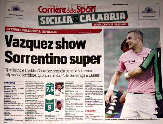 Corriere dello Sport: “Vazquez show, Sorrentino super. Lazaar non è in giornata – le pagelle”