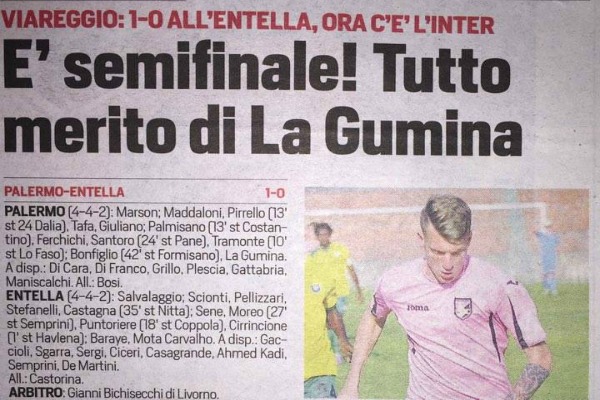 “Il Palermo continua a volare e nei minuti finali conquista la semifinale della Viareggio Cup. La copertina è tutta per Antonino La Gumina che ormai agli sgoccioli della partita, dopo un primo tempo movimentato dall’Entella ed un secondo col Palermo più intraprendente, quando i rigori sembravano dietro l’angolo, ha scavato il gol della vittoria che ha piegato la formazione ligure che mastica amaro. Eguagliato il miglior risultato di sempre dei rosanero nella competizione del 2014 […]”. Questo quanto si legge sull’edizione odierna de “Il Corriere dello Sport”.