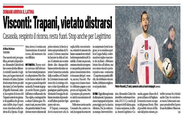 Corriere dello Sport: “Visconti: «Trapani, vietato distrarsi» Casasola, respinto il ricorso, resta fuori. Stop anche per Legittimo”