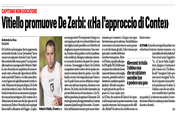 “De Zerbi ha un’immagine che lo rappresenta nel mondo virtuale. La sua “proiezione” ha un nome e un cognome: Antonio Conte. È possibile metterli sullo stesso piano? La risposta è affermativa se a paragonarli è Roberto Vitiello, uno che parla con cognizione di causa essendo stato a Siena alle dipendenze dell’attuale coach del Chelsea: «Le idee sono diverse ma l’approccio agli allenamenti è molto simile. Dal punto di vista psicologico, De Zerbi si avvicina molto a Conte». Per il tecnico lombardo si tratta di un accostamento impegnativo ma anche prestigioso. Ed è curioso che a sbilanciarsi sia stato uno dei due giocatori di movimento (l’altro è Pezzella) mai impiegati finora dall’ex allenatore del Foggia: «Capitano non giocatore? Il campionato è lungo e ci sarà spazio per tutti. Io cercherò di fare le cose nel miglior modo possibile con l’obiettivo di ritagliarmi un posto la domenica. Sono sereno, il mister mi ha parlato e mi ha manifestato la sua fiducia. Bisogna continuare a lavorare cercando di mettere da parte l’io e pensare al noi». Il messaggio è chiaro: De Zerbi ha conquistato anche coloro che in questo momento si trovano dietro le quinte: «Lui e Ballardini, tecnico che ringraziamo per l’aiuto e con il quale l’anno scorso abbiamo conquistato una salvezza insperata, chiedono cose diverse. De Zerbi, che ha idee innovative, ha portato linfa nuova ed entusiasmo». Con Vitiello in panchina, il capitano è Diamanti: «È il nostro giocatore più rappresentativo, è entrato in punta di piedi ma già si fa sentire». Il contributo del fantasista toscano può essere determinante per i rosanero: «Cinque o sei squadre lotteranno per la salvezza. Noi dobbiamo concentrarci sul nostro lavoro senza pensare a ciò che fanno gli altri. Tutti ci danno per spacciati e sarebbe bello fare ricredere tanta gente». Battere il Torino, squadra alla quale il 29 aprile 2015 il difensore campano ha realizzato la sua unica rete finora con la maglia rosanero, potrebbe indurre i detrattori a cambiare qualche giudizio: «Ricordo con piacere quel gol anche perché segnare in A non capita spesso. Il Toro, che assieme al Chievo è la sorpresa del campionato in questo momento, è una squadra attrezzata. Sarà una gara molto difficile. Belotti? Si vedeva che avrebbe avuto un futuro roseo». […]”. Questo quanto riportato da “Il Corriere dello Sport”.