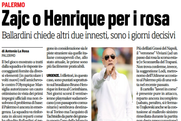 “Il bel gioco mostrato a tratti dalla squadra e le risposte incoraggianti fornite da diversi elementi (in particolare i volti nuovi) nell’amichevole contro l’Olympique Marsiglia autorizzano un cauto ottimismo in vista dei primi impegni ufficiali ma non risolvono il problema di base: il Palermo è ancora in emergenza. La squadra va rinforzata in alcuni reparti come ha ribadito Ballardini al termine della gara: «Dobbiamo proseguire su questa strada ma la rosa deve essere ampliata. Servono, in particolare, un regista e un attaccante». Una delle priorità è la ricerca di un centrocampista che possa raccogliere l’eredità di Maresca e alzare il tasso qualitativo del gruppo. Gli addetti ai lavori rosanero tengono in considerazione sia le piste straniere sia quelle italiane consapevoli che, allo stato attuale, le prime sono più facilmente praticabili. URGENZE. I riflettori, in questo caso, sono puntati soprattutto sul brasiliano Bruno Henrique in forza al Corinthians. Nei giorni scorsi il ventiseienne playmaker sudamericano (con passaporto comunitario) sembrava destinato al Torino ma l’acquisto di Tachtsidis da parte dei granata sposta l’ago della bilancia verso la società di viale del Fante, costantemente in contatto con il club paulista (che detiene solo il 25 per cento di un cartellino frazionato tra più attori) in attesa di segnali positivi. Nei radar, inoltre, è rimasto Zajc, sloveno classe ’94 dell’Olimpija Ljubljana. Il ds Faggiano, in ogni caso, farà il possibile per non farsi trovare impreparato nel caso in cui dovessero presentarsi soluzioni favorevoli nel panorama calcistico nazionale. Diversi i profili funzionali alle esigenze di Ballardini: piacciono Marrone della Juventus e Mazzitelli, talento scuola Roma chiuso al Sassuolo da Magnanelli e Sensi. Più defilati Grassi del Napoli, il “veronese” Viviani (ad un passo dai rosa la scorsa estate) e Scozzarella del Trapani. Non trova conferme, invece, la suggestione Lodi, metronomo dell’Udinese accostato al Palermo più di una volta nel recente passato. Il cartello “lavori in corso” è presente pure in attacco, reparto ancora incompleto (sabato, peraltro, si è fermato Trajkovski anche se la contusione al malleolo sinistro rimediata durante la partita non desta preoccupazione) e da integrare con uno o due elementi. Nestorovski, che come Gilardino deve essere servito in un certo modo per potere incidere, non può essere l’unico punto di riferimento. Fanno parte della lista dei “papabili” Falcinelli del Sassuolo e Avenatti, uruguaiano in forza alla Ternana”. Questo quanto si legge sull’edizione odierna de “Il Corriere dello Sport”.