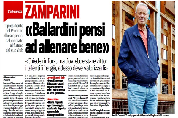 Corriere dello Sport: “Zamparini: «Ballardini pensi ad allenare bene. Cascio? I cinesi hanno altro spessore…Felice di aver ridato dignità al Palermo ma adesso vendo»”