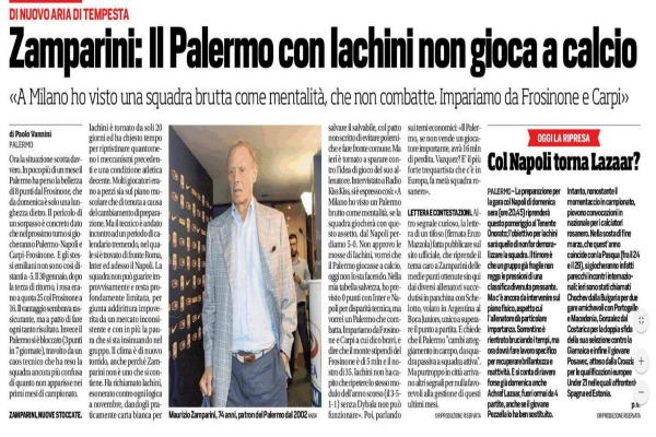 “Ora la situazione scotta davvero. In poco più di un mese il Palermo ha perso la bellezza di otto punti sul Frosinone che da domenica è solo una lunghezza dietro. Il pericolo di un sorpasso è concreto dato che giocheranno Palermo-Napoli e Carpi-Frosinone. Il Palermo si è bloccato, travolto da un caos tecnico che ha reso la squadra ancora più confusa. Intanto Zamparini ieri è tornato a sparare contro il suo allenatore: «A Milano ho visto un Palermo brutto come mentalità, se la squadra giocherà con questo assetto, dal Napoli perdiamo 5-0. Non approvo le mosse di Iachini, vorrei che il Palermo giocasse a calcio, oggi non lo sta facendo» […]”. Queste le parole di Zamparini analizzate oggi da “Il Corriere dello Sport”.