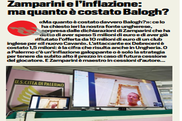 “«Ma quanto è costato davvero Balogh?»: ce lo ha chiesto ieri la nostra fonte ungherese, sorpresa dalle dichiarazioni di Zamparini che ha detto di aver speso 5 milioni di euro e di aver già ri utato l’o erta da 10 milioni di euro di un club inglese per «il nuovo Cavani». L’attaccante ex Debreceni è costato 1,5 miloni: è la cifra che risulta anche in Ungheria. O a Palermo c’è un’in azione galoppante o è solo la strategia per tenere da subito alto il prezzo in caso di futura cessione del giocatore. E Zamparini è maestro in cessioni d’autore…”. Questo quanto si legge sull’edizione odierna de “Il Corriere dello Sport”.