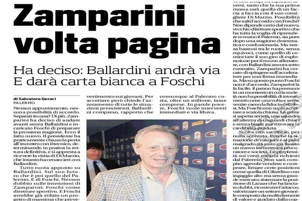 “Nessun appuntamento, nessuna possibilità di accordo. Separati in casa? Di più, Zamparini ha deciso di andare avanti senza Ballardini e ha incaricato Foschi di preparare la prossima stagione. Ecco il fatto nuovo, il presidente ha praticamente chiuso la porta all’incontro con il tecnico, determinando in pratica la rottura definitiva e si appresta a ricevere la visita di Di Marzio che intanto ha cenato ieri con Ballardini. Tutto ruota appunto su Ballardini. Sul suo futuro che è poi quello del Palermo. E di Foschi. Nessun dubbio sulle intenzioni di Zamparini: Foschi come direttore sportivo. E Foschi avrebbe già stilato un progetto di massima che prevede nuovo allenatore (Oddo, Stellone o Baroni), rivoluzione nell’organico e un investimento sui giovani. Per accettare però chiede l’azzeramento di tutte le situazioni preesistenti, Ballardini compreso, rapporto che comunque al Palermo costa, oltre un milione, tasse comprese, in parole povere, Foschi vuole interventi immediati e via libera. QUESTIONE DI TEMPO Intanto, la rescissione del contratto con Ballardini, poi nessuna interferenza nei programmi, il che significa piena autonomia del suo gruppo di lavoro Zamparini è d’accordo ma si muove con tempi ed equilibri diversi, tanto che la sua prima mossa sarà quella di un faccia a faccia con il suo consigliere Di Marzio. Possibilità che salti l’accordo con Foschi? Non dipende certo dal nuovo vecchio direttore sportivo che ha tutta la voglia di riprendere in mano il Palermo, sia pure dopo una stagione drammatica e confusionaria. Ma senza bastoni tra le ruote, senza equivoci, come quello di cominciare il suo giro di esplorazione per il nuovo allenatore, con Ballardini ancora sotto contratto. Zamparini ha cercato di spingere sull’acceleratore per una firma immediata. Ma su questo punto Foschi non è d’accordo Zamparini la fa facile, il patron ha premura in un momento in mi la società non ha possibilità di investimenti come una volta e sente venire meno la fiducia dei tifosi. Ma Foschi non vuole accettare a scatola chiusa. La gente si aspetta serietà, una Squadra all’altezza di traguardi chiari e senza bugie per ritrovare la credibilità perduta. Svolta con sacrificio, per nulla scontata. Perché la situazione di Vazquez è al palo malgrado sia già stato già fissato un nuovo incontro tra procuratore e società le perplessità sui venti milioni richiesti dal Palermo. Non sarà compito agevole vendere e comprare, limare certe posizioni come quella di Gilardino con ingaggio alto ma senza grande mercato; sistemare anche Lazaar che ha lasciato dubbi, ricostruire l’attacco, valorizzare un settore giovanile composto da elementi di valore e guidato dalla coppia Baccin e Bosi, unica nota positiva della stagione”. Questo quanto riporta l’edizione odierna de “Il Corriere dello Sport”.