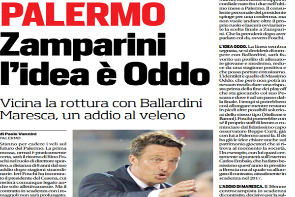 Corriere dello Sport: “Zamparini, l’idea è Oddo. Vicina la rottura con Ballardini, Maresca addio al veleno”