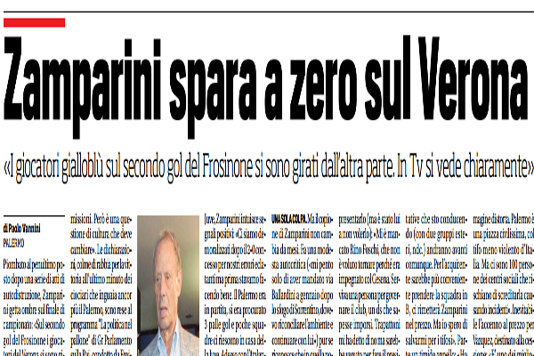Corriere dello Sport: “Zamparini spara a zero sul Verona: «I giocatori gialloblù sul secondo gol del Frosinone si sono girati dall’altra parte. Serve prova Tv!»”