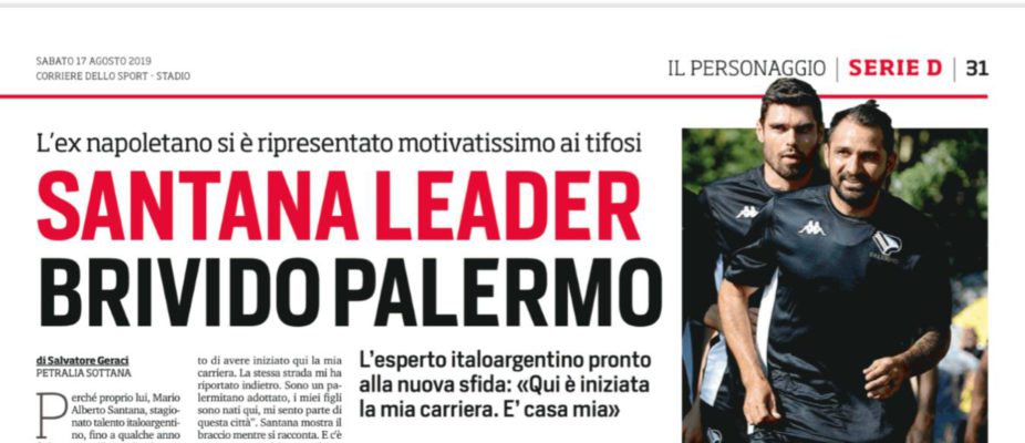 L’edizione odierna del “Corriere dello Sport” riporta le dichiarazioni rilasciate ieri in conferenza stampa da Mario Alberto Santana direttamente dal ritiro del Palermo di Petralia Sottana. Sui motivi del suo ritorno l’argentino ha dichiarato: «Sono stato io a contattare Sagramola per chiedergli di far parte di questa nuova era. Mi hanno dato fiducia e li ringrazierò a vita. Ci sono tanti giocatori senza lavoro, dobbiamo sentirci fortunati per questa opportunità. Cercherò di ripagarli al massimo. Se sono qui è perché mi ritengo integro. Non fossi stato in grado di fare due metri, avrei cambiato lavoro. Vivo a Palermo e so di andare incontro a difficoltà. Però, posso dare ancora tanto». L’emozione è davvero tanta: «Tutto mi emoziona, piccole e grandi cose: la famiglia, i parenti, la città, il fatto di avere iniziato qui la mia carriera. La stessa strada mi ha riportato indietro. Sono un palermitano adottato, i miei figli sono nati qui, mi sento parte di questa città». L’argentino si è detto pronto e determinato: «Sarà l’anno più importante della mia carriera. Palermo mi ha cresciuto e lanciato. E mi viene la pelle d’oca, solo a parlarne. Frosinone poteva rappresentare il canto del cigno. A Genova, ho fatto sei mesi fuori rosa. Avevo deciso di smettere, non sentivo più gli stimoli quando mi ha chiamato la Pro Patria. Dopo tanta insistenza ho accettato. Ora questo tuffo nel passato, ma con la voglia di scrivere una favore». E sul passato in rosanero: «Quel Palermo non esiste più, anche i compagni capiscano. Con la Pro Patria ho fatto la seconda punta, direi benino, anche se alla mia età devo imparare certi movimenti. Comunque un contributo alla Pro Patria l’ho dato. Trequartista? Ho ricoperto più volte il ruolo, ci penserà Pergolizzi a sistemarmi nel migliore dei modi. Coppia gol con Ricciardo? Non lo conoscevo. Ci vorrà tempo, ma siamo intelligenti e tutto diventa più facile». Capitano? «Non so se chiamarmi leader, tutti dovranno esserlo, poi capitano lo si diventa in campo. Sarà un anno con tante aspettative, c’è da trasferire la nostra esperienza ai più giovani. Durante gli allenamenti non sento volare mosca significa che sono concentrati. La squadra si sta comportando bene e sappiamo di avere una grande responsabilità. Ce la prenderemo noi grandi. Mi aspettavo questo amore da parte dei palermitani e capisco che i ragazzi possano avere un po’ di paura. Hanno tuttavia valori e disponibilità. Cercheremo di essere bravi noi a dar loro la tranquillità necessaria. In D non conta se uno è più bravo di un altro. La differenza la fa lo spogliatoio. E noi siamo una famiglia. Se la squadra va dritta verso la montagna che deve scalare, non troverà ostacoli. ».