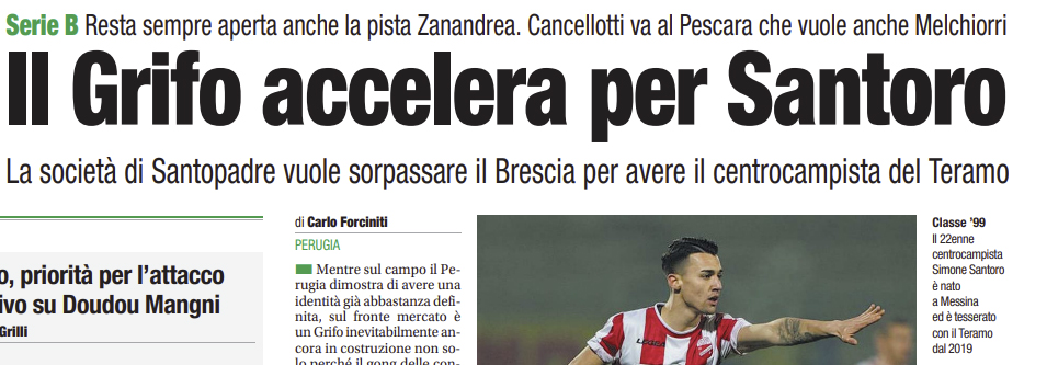 Corriere dell’Umbria: “Il Grifo accelera per Santoro. Il Palermo vuole Sounas”