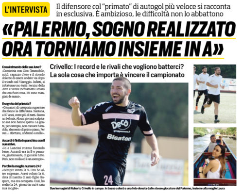 L’edizione odierna del “Corriere dello Sport” riporta le dichiarazioni di Roberto Crivello, difensore del Palermo. Pergolizzi, una sorpresa? «Avevo molti amici nella squadra che vinse lo scudetto Primavera con lui. Curiale mi aveva avvisato: “Un martello e un motivatore, se dai tutto è felice”». Perché la D e rinunciare a molti quattrini? «Il Palermo non ha prezzo». Ha un accordo per il futuro? «Un progetto esiste, sia pure a parole. Il mio obiettivo è tornare in A. Tutte quelle sensazioni che non ho vissuto da bambino le sto provando adesso. Un sogno che sono riuscito a realizzare».