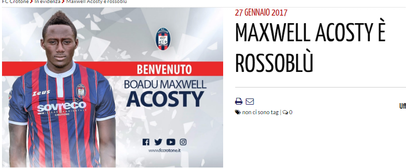 “La Società FC Crotone annuncia un nuovo acquisto: Maxwell Acosty è ufficialmente un calciatore rossoblù. 25 anni, originario del Ghana, Maxwell è un’ala destra veloce e possente. Può giocare anche con grande efficacia come punta centrale o come ala sinistra. Vanta 115 presenza in Serie B con 11 gol e un’esperienza specifica anche in Serie A con le maglie di Chievo e Fiorentina. Per lui pronto un contratto triennale. Il calciatore raggiungerà immediatamente il resto della squadra. L’accordo è stato stipulato e concluso dal Club Manager Raffaele Vrenna, recatosi a Milano per seguire personalmente le trattative di mercato”.