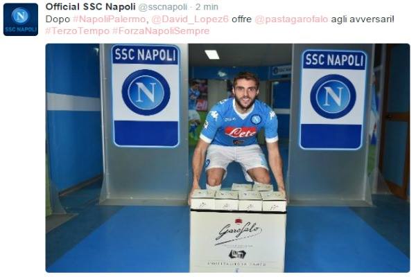 Al termine del match tra Napoli e Palermo, David Lopez ha omaggiato gli avversari ha offerto pacchi di pasta garofalo. Come si può vedere dalla foto, pubblicata sull’account twitter ufficiale della società partenopea.