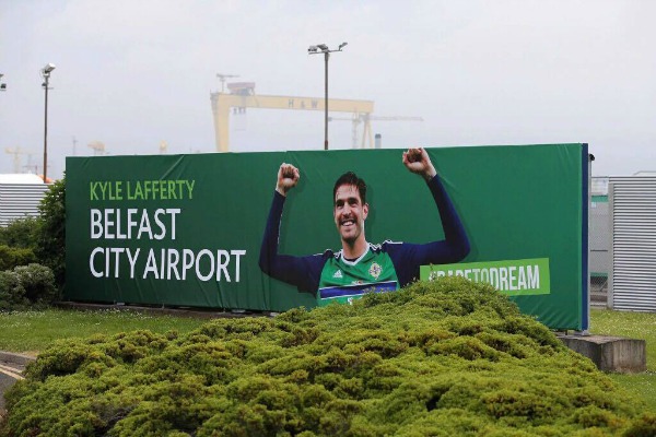 Per la sola giornata di oggi, l’aeroporto di Belfast (George Best Belfast City Airport) si chiamerà Kyle Lafferty Belfast City Airport. Ciò è stato fatto a sostegno dell’Irlanda del Nord in vista dell’impegno europeo in Francia. La segnaletica sul tetto del terminal dell’aeroporto e all’ingresso sono state sostituite per onorare l’ex attaccante del Palermo. Anche sul sito web dello scalo è stato modificato il nome. Ecco in basso la foto: