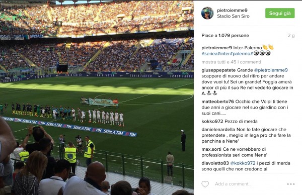 Sfumata la pista Balotelli, in queste ultime ore di mercato il Palermo è alla ricerca frenetica di un attaccante. Uno dei nomi più vicini al club di viale del Fante è quello di Iemmello dello Spezia. E mentre i club lavorano al suo futuro, c’è da segnalare che lo stesso attaccante domenica scorsa si trovava a “San Siro” per assistere alla sfida tra l’Inter ed i rosanero. In alto la foto pubblicata da Iemmello su Instagram.