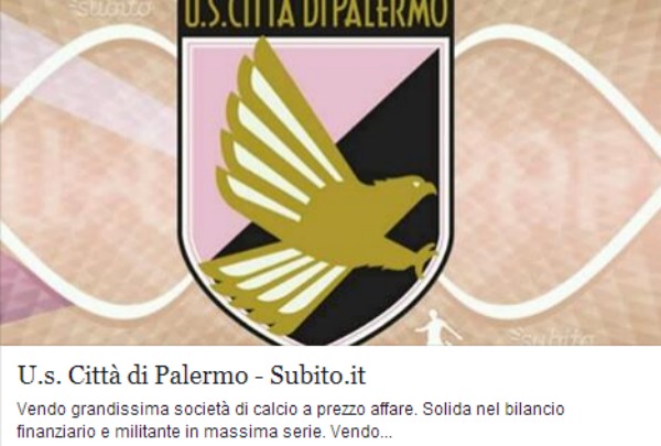 Il Palermo è in vendita. No, non è il solito grido di Zamparini, ma un annuncio sul web apparso sul famoso sito Subito.it: “Vendo grandissima società di calcio a prezzo affare – si legge – solida nel bilancio finanziario e militante in massima serie. Vendo per inutilizzo in quanto non ho più né il tempo necessario e né la pazienza per farla competere con le altre società del nord. ASTENERSI PERDITEMPO, CHIAMARE A ORARIO PARTITE. Buon Natale!”. Questo il testo dell’inserzione pubblica il 25 dicembre scorso da un certo Maurizio Z. Base d’asta: 3 milioni. Al via con le offerte. Sotto la foto dell’annuncio.