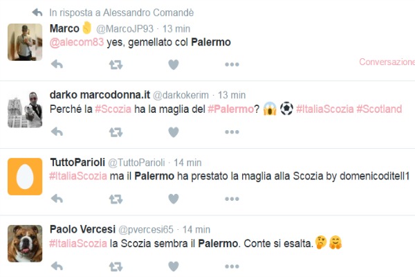 In occasione di Italia-Scozia, ultima amichevole degli azzurri prima dell’inizio di Euro 2016, gli uomini di Strachan sono scesi in campo con una particolare maglia di colore rosa. E i commenti ironici su Twitter su un paragone tra Scozia e Palermo non si sono fatti attendere: “Fa piacere che il Palermo sia stato promosso a rango di selezione Nazionale” e “L’Italia sta giocando contro il Palermo” sono i più “retwittati”, mentre c’è anche chi non perde occasione per citare il presidente rosanero: “Zamparini chiama Strachan per esonerarlo ma poi si accorge che quello in campo non è il Palermo” si legge. In alto alcuni dei tweet degli utenti.