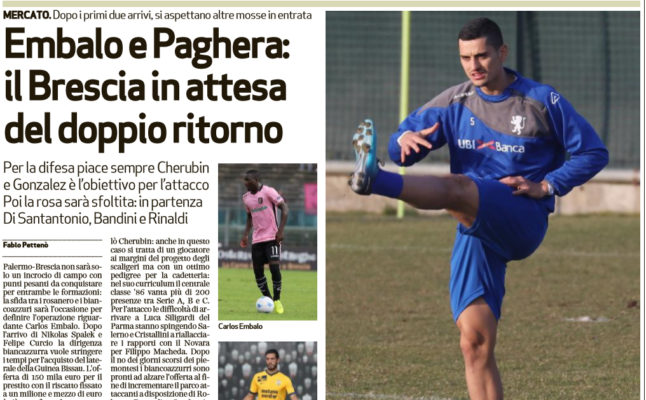 “Palermo-Brescia non sarà solo un incrocio di campo con punti pesanti da conquistare per entrambe le formazioni: la sfida tra i rosanero e i biancoazzuri sarà l’occasione per definire l’operazione riguardante Carlos Embalo. Dopo l’arrivo di Nikolas Spalek e Felipe Curcio la dirigenza biancazzurra vuole stringere i tempi per l’acquisto del laterale della Guinea Bissau. L’offerta di 150 mila euro per il prestito con il riscatto fissato a un milione e mezzo di euro è già stata formulata, mentre l’ostacolo è legato all’insistenza del tecnico Bruno Tedino desideroso di trattenere Embalo in rosa. Di contro c’è la volontà del giocatore, apertamente espressa dal suo agente Beppe Accardi, voglioso di lasciare la Sicilia per ritrovare a Brescia Roberto Boscaglia: l’allenatore che più di tutti lo ha valorizzato. In agenda gli uomini mercato del Brescia hanno fissato un incontro prima della sfida del Renzo Barbera fiduciosi di poter ritornare in città, la sera stessa, con Carlos Embalo aggregato al gruppo capitanato da Andrea Caracciolo”.