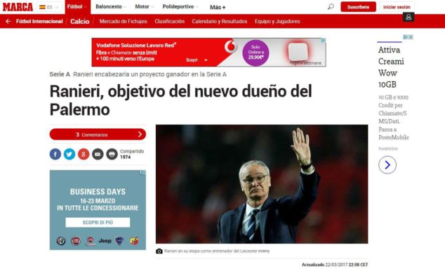 Anche la stampa spagnola riporta l’indiscrezione circolata nelle scorse settimane riguardante Claudio Ranieri come prossimo allenatore del Palermo. “Marca.com” infatti, scrive che l’ex Leicester sarebbe l’obiettivo numero 1 di Paul Baccaglini per il Palermo che verrà.