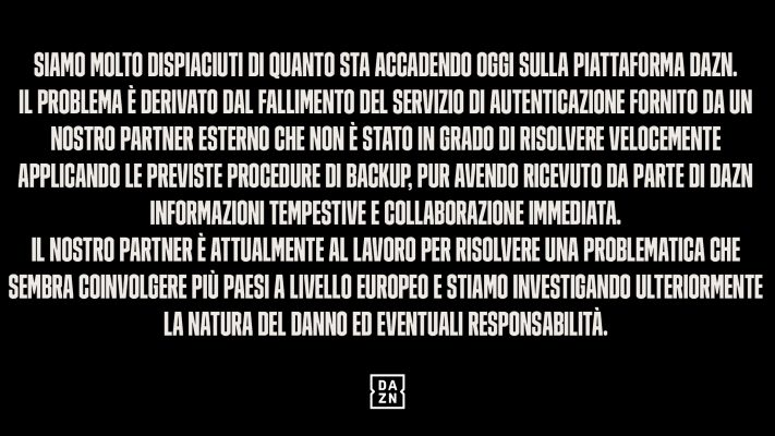 “Siamo molto dispiaciuti di quando accaduto nel corso della visione della partita Inter Cagliari. Il problema è derivato dal fallimento del servizio di autenticazione fornito da un nostro partner esterno che non è stato in grado di risolvere velocemente applicando le previste procedure di backup, pur avendo ricevuto da parte di DAZN informazioni tempestive e collaborazione immediata. Il nostro partner è attualmente al lavoro per risolvere una problematica che sembra coinvolgere più paesi a livello Europeo e stiamo investigando ulteriormente la natura del danno ed eventuali responsabilità”.