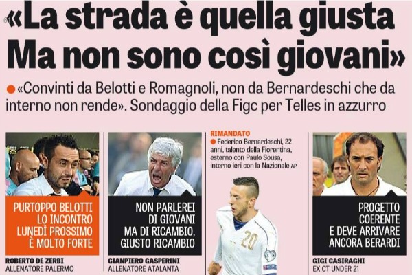 Ha parlato così il tecnico rosanero Roberto De Zerbi ai microfoni de “La Gazzetta dello Sport”: «Belotti è davvero un giocatore forte, il mio problema è che devo incontrarlo lunedì. Questi ragazzi non sono proprio giovani, ma in Italia sembra strano vedere tanti ventiquattrenni entrare in Nazionale così improvvisamente. Ma questi attualmente sono i migliori e sono già cresicuti abbastanza, ad esempio Verratti nel suo ruolo è il più forte. Bernardeschi non ha trovato la sua posizione anche se è un talento puro».