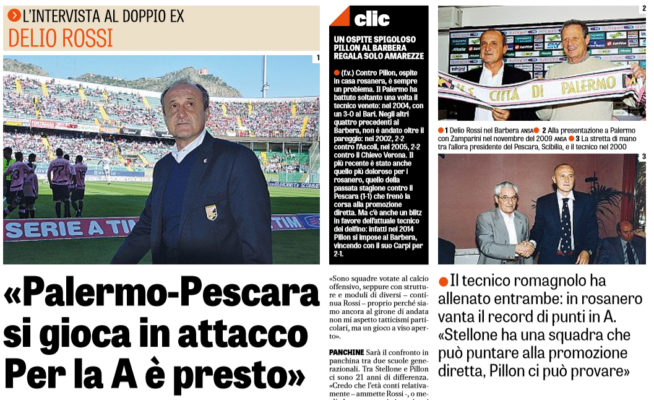 “Il big match di domenica sera lo coinvolge. Palermo e Pescara sono state due tappe della sua carriera, seppure in momenti diversi e con risultati contrapposti. Categorie differenti con relativi obiettivi. Delio Rossi in rosanero tra il 2009 e il 2011 ha mancatola qualificazione in Champions League per un niente, due punti, ha stabilito il record di punti in Serie A dell’era Zamparini, 65, e ha conquistato una finale di Coppa Italia persa con l’Inter nel 2011. Con gli abruzzesi il rapporto è nato nella prima parte della sua carriera di allenatore, con esperienze in due momenti diversi, ma sempre in Serie B: la prima nel 1996-97 con una stagione iniziata benissimo che faceva preludere alla promozione in Serie A, poi mancata nel girone di ritorno a causa di un calo di rendimento della squadra. La seconda, meno positiva, nel 2000-2001 terminata con la retrocessione in C dopo un esonero e un ritorno in extremis in panchina.
