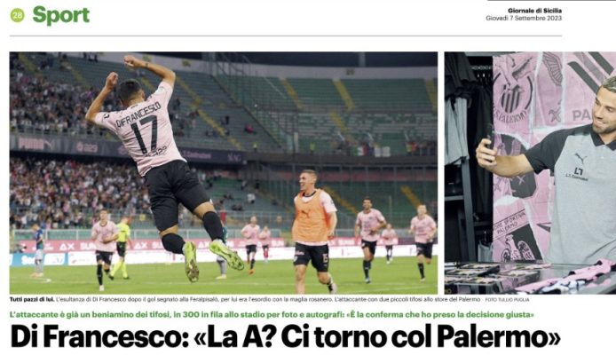 In tanti lo hanno ritenuto il vero colpo di mercato dell’estate rosanero, per la lunga esperienza tra Serie A e B e per aver accettato di scendere di categoria dopo un inizio di stagione sfavillante a Lecce: un’ulteriore conferma dell’entusiasmo che ha circondato l’arrivo di Di Francesco è data dalle trecento persone circa che stamattina, a margine della presentazione del giocatore in viale del Fante, hanno incontrato il giocatore per una foto o un autografo. Si tratta del secondo assaggio del calore del popolo rosanero per il nuovo numero 17: il primo lo ha avuto sabato in due momenti separati, quello dell’ingresso in campo nel finale con la Feralpisalò e quello dell’abbraccio del Barbera dopo la rete che ha sigillato la sfida. Un gol che Di Francesco racconta di aver «dedicato alla mia famiglia, che è ancora a Lecce, ma so per certo che una cena a Soleri la devo pagare perché in quella situazione nove attaccanti su dieci avrebbero tirato, mentre lui mi ha passato la palla. Non potevo desiderare esordio migliore».