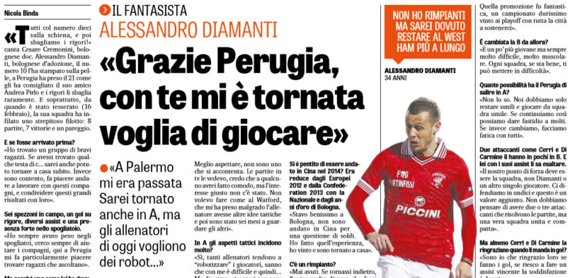 “«Tutti col numero dieci sulla schiena, e poi sbagliamo i rigori!» canta Cesare Cremonini, bolognese doc. Alessandro Diamanti, bolognese d’adozione, il numero 10 l’ha stampato sulla pelle, a Perugia ha preso il 21 come gli ha consigliato il suo amico Andrea Pirlo e i rigori li sbaglia raramente. E soprattutto, da quando è stato tesserato (16 febbraio), la sua squadra ha infilato uno strepitoso filotto: 8 partite, 7 vittorie e un pareggio. E se fosse arrivato prima? «Ho trovato un gruppo di bravi ragazzi. Se avessi trovato qualche testa di c… sarei anche potuto tornare a casa subito. Invece sono contento, fa piacere andare a lavorare con questi compagni, e condividere questi grandi risultati con loro». Sei spezzoni in campo, un gol su rigore, diversi assist e una presenza forte nello spogliatoio. «Ho sempre avuto peso negli spogliatoi, cerco sempre di aiutare i compagni, qui a Perugia mi fa particolarmente piacere trovare ragazzi che ascoltano». Ma perché uno come lei ha dovuto aspettare quasi 8 mesi per trovare squadra? «Una scelta mia. Dopo l’anno nel Palermo mi era un po’ passata la passione, a livello umano. Perugia mi è piaciuta subito e sto tornando il vero Diamanti». Otto mesi che non ha passato sul divano… «Macché divano! Mi sono allenato seriamente all’Isokinetic e anche con gli Allievi nazionali del Bologna di mister Magnani». Dica la verità: aspettava una chiamata dalla A. «Qualche chiamata l’ho anche avuta, ma erano un po’ forzate. Nulla di serio e convincente. Meglio aspettare, non sono uno che si accontenta. Le partite in tv le vedevo, credo che a qualcuno avrei fatto comodo, ma l’interesse giusto non c’è stato. Non volevo fare come al Watford, che mi ha preso malgrado l’allenatore avesse altre idee tattiche e poi sono stato sei mesi a guardare gli altri». […]”.