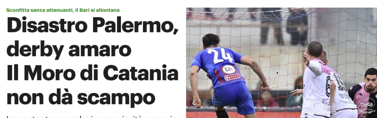 Derby amaro. Il Palermo regala un pomeriggio di festa al Catania e ai suoi fans, rinuncia alla possibilità di avvicinare il Bari e si fa raggiungere al secondo posto dalla Turris. Tutto questo in un pomeriggio umido ma non freddo in cui la squadra di Filippi in pratica non è neppure entrata in campo, piegandosi alla grinta del Catania e al talento purissimo del giovane bomber etneo Luca Moro, capocannoniere del torneo di Serie C con 18 reti.