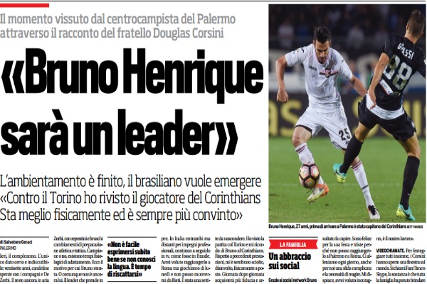Intervistato da “Il Corriere dello Sport”, Douglas Corsini, fratello del centrocampista del Palermo Bruno Henrique, ha affermato: ««Il mio regalo per il suo compleannno? Un grande abbraccio e la speranza condivisa che a Roma… L’ho chiamato mentre faceva autografi allo store, mi sembra tranquillo e felice. Mi ha confidato che sta bene e che la squadra ha voglia di ottenere un grande risultato. Se volete la mia opinione manca poco perché Bruno arrivi al massimo della condizione