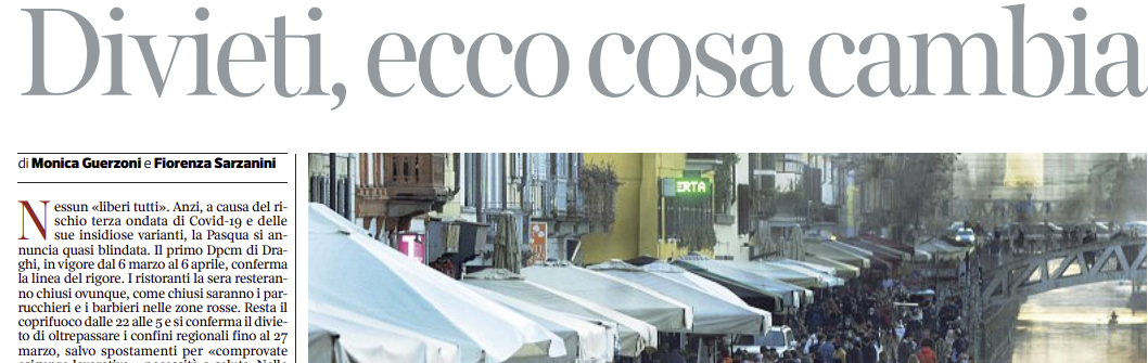 Le varianti di Coronavirus spaventano l’Italia il premier Draghi corre ai ripari, si preannuncia una Pasqua blindatissima. Il primo Dpcm di Draghi, in vigore dal 6 marzo al 6 aprile, conferma la linea del rigore. L’edizione odierna del “Corriere della Sera” fa il punto della situazione, i ristoranti la sera resteranno chiusi ovunque, come chiusi saranno i parrucchieri e i barbieri nelle zone rosse. Resta il coprifuoco dalle 22 alle 5 e si conferma il divieto di oltrepassare i confini regionali fino al 27 marzo, salvo spostamenti per «comprovate esigenze lavorative», necessità o salute. Nelle zone rosse non sarà possibile andare a trovare amici e parenti, come invece è permesso a due persone, per una sola volta al giorno, nelle aree di rischio gialle e arancioni. La novità importante è la riapertura dei cinema, dei teatri e delle sale da concerto dal 27 marzo nelle zone gialle, con «posti a sedere preassegnati e distanziati». Restano in vigore le regole base: mascherina obbligatoria al chiuso e all’aperto e divieto di assembramento. La ministra Gelmini ha voluto che fosse inserita nel testo l’istituzione presso il ministero della Salute di un «tavolo tecnico permanente» con Regioni e Iss, per «l’eventuale revisione o aggiornamento dei parametri».