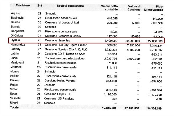 Nonostante l’operazione si riferisca alla stagione 2015/16 la plusvalenza è registrata nel bilancio al 30 giugno 2015. La cessione di Dybala alla Juventus avviene infatti il 4 giugno 2015, pochi giorni prima della chiusura dell’esercizio (fatto quindi rientrare nel rendiconto al 2015, nonostante il trasferimento sia diventato effettivo per la Figc soltanto dall’1 luglio successivo).