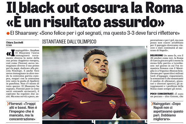 Intervenuto al termine di Roma-Austria Vienna di Europa League, terminata 3-3, Stephan El Shaarawy autore di una doppietta contro gli austriaci si è così espresso sull gara di ieri proiettandosi sul match contro il Palermo: «Sono felice per i gol segnati, ma questo 3-3 deve farci riflettere. E’ un risultato assurdo. Non so cosa sia successo ma senza continuità non si va da nessuna parte. Abbiamo perso una partita già chiusa. Questi gol incassati ci devono far riflettere perché non dobbiamo tornare indietro. La partita, fino a quel momento, era stata buona, adesso dobbiamo pensare al Palermo».