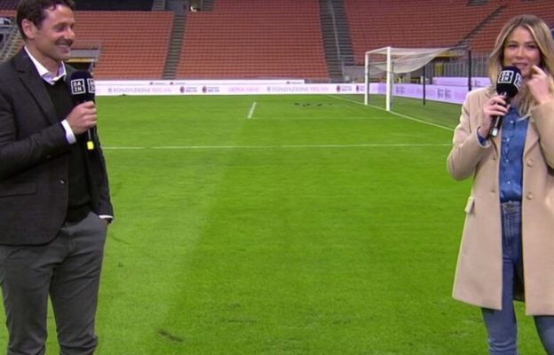 In occasione della gara di campionato tra Milan e Genoa, in merito alle ultime disposizioni di sicurezza legate al Coronavirus, nel corso della diretta la conduttrice di Dazn Diletta Leotta ha mantenuto la distanza prevista dall’opinionista Gobbi. In alto la foto.