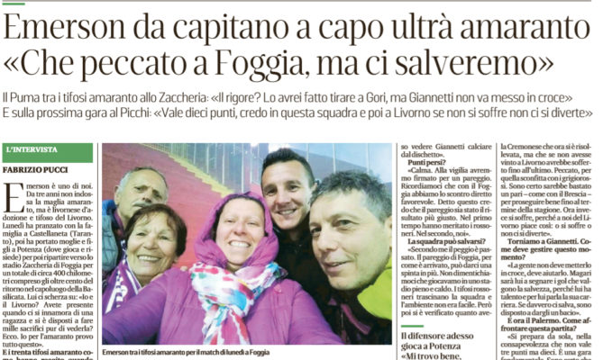 Da tre anni Emerson non indossa più la maglia amaranto, ma è livornese d’adozione e tifoso del Livorno. Lunedì ha pranzato insieme alla famiglia a Castellaneta (Taranto), poi ha portato moglie e figli a Potenza per poi partire verso lo stadio Zaccheria di Foggia. Intervenuto ai microfoni de “Il Tirreno”, Emerson ha parlato appunto del suo amore per il Livorno: «Io e il Livorno? Avete presente quando ci si innamora di una ragazza e si è disposti a fare mille sacrifici pur di vederla? Ecco. Io per l’amaranto provo tutto questo». E i trenta tifosi amaranto come hanno reagito quando l’hanno vista? «È stato bellissimo. Abbracci, baci. Grande affetto. Nessuno sapeva che sarei andato, ma in realtà avevo il biglietto da qualche giorno. Ero pronto anche per andare a Salerno a ottobre, ma poi feci tardi all’allenamento». La squadra può salvarsi? «Secondo me il peggio è passato. Il pareggio di Foggia, per come è arrivato, può darci una spinta in più. Non dimentichiamoci che giocavamo in uno stadio pieno e caldo. I tifosi rossoneri trascinano la squadra e l’ambiente non era facile. Però poi si è verificato quanto avevo detto a Luci nei giorni precedenti: se li avessimo messi in difficoltà, la gente li avrebbe fischiati. Diciamo che gli amaranto sono stati bravi a rientrare in partita». E le quattro sconfitte di fila come la spiega? «Fisiologico. Nessuno deve mai dimenticare che questa squadra ha fatto un’incredibile rincorsa per giocarsi la salvezza a primavera. Un calo fisico e mentale poteva essere messo in conto. Ora ce la stiamo giocando. E dobbiamo essere felici di questo». Possiamo salvarci direttamente o saranno playout? «Mi pare che lì dal calderone non scappi nessuno. E ricordiamoci la difficoltà di questo campionato: 19 squadre, i riposi, compagini costruite per andare in serie A che si sono trovati nei bassifondi. Penso alla Cremonese che ora si è risollevata, ma che se non avesse vinto a Livorno avrebbe sofferto fino all’ultimo. Peccato, per quella sconfitta con i grigiorossi. Sono certo sarebbe bastato un pari – come con il Brescia – per proseguire bene fino al termine della stagione. Ora invece si soffre, perché a noi del Livorno piace così: o si soffre o non ci si diverte». Torniamo a Giannetti. Come deve gestire questo momento? «La gente non deve metterlo in croce, deve aiutarlo. Magari sarà lui a segnare i gol che valgono la salvezza, perché lui ha talento e per lui parla la sua carriera. Se davvero ci salva, sono disposto a dargli un bacio». E ora il Palermo. Come affrontare questa partita? «Si prepara da sola, nella consapevolezza che non vale tre punti ma dieci. È una gara fondamentale. Sono certo che i ragazzi faranno una gran partita. Il motivo? Non hanno nulla da perdere. Dopo quell’inizio di campionato e dopo il primo tempo di Foggia erano spacciati. Ora sono vivi. E questo deve garantire un approccio pieno di grinta e di entusiasmo con i rosanero».