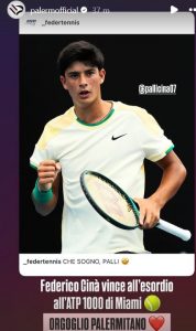 La giornata di ieri, mercoledì 19 marzo, è stata memorabile per il giovane Federico Cinà. Il tennista palermitano classe 2007 ha infatti vinto la partita di esordio delle ATP 1000 di Miami contro l’argentino Francisco Comesana, situato molto più in alto nella classifica mondiale, imponendosi per 2 a 0. Ai tanti complimenti ricevuti dal talento italiano, arrivano anche quelli del Palermo che, attraverso le proprie Instagram stories, ha condiviso un post aggiungendo la seguente didascalia: “Orgoglio italiano”.