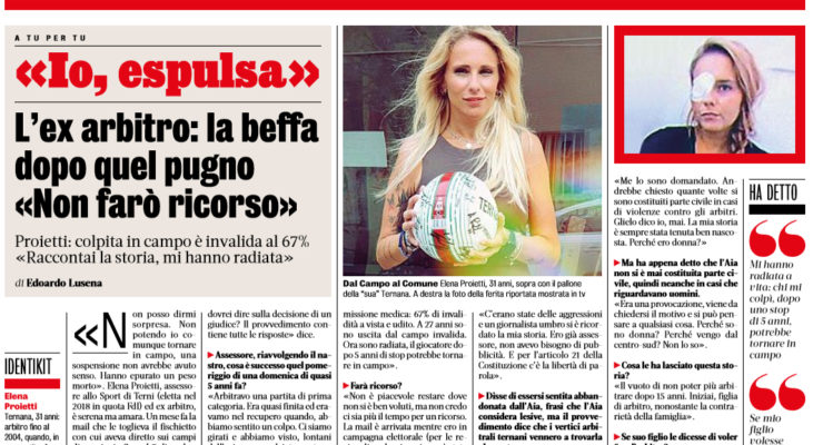 L’edizione odierna della “Gazzetta dello Sport”si sofferma su Elena Proietti, assessore allo Sport di Terni (eletta nel 2018 in quota FdI) ed ex arbitro. Un mese fa la mail che le toglieva il fischietto con cui aveva diretto sui campi di provincia fino al 7 dicembre 2014. Tessera addio :l’ha stabilito la commissione disciplinare umbra dell’Aia, per aver rilasciato un anno fa interviste non autorizzate e per avere leso l’immagine dell’associazione. Un provvedimento che il numero uno degli arbitri italiani, Marcello Nicchi, non commenta: «C’è chi ha deciso e non sono stato io, che