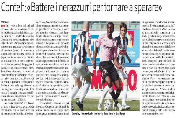 Intervistato dalle colonne de “Il Giornale di Sicilia” l’ex rosanero Kewullay Conteh si è espresso in merito alla stagione dei rosanero: «Ai rosa resta poco, ma quel poco va valorizzato al massimo. Quando il campionato sta per finire e ci si ritrova penultimi è quasi inutile parlare di moduli, tattica 0 calciatori più o meno determinanti. Restano soltanto l’orgoglio e il cuore, chi ce li ha deve tirarli fuori. Tutto il resto è poesia. Anche perché in questa stagione, al Palermo. c’è stato un bel… casino. Atalanta? Conosco bene l’ambiente atalantino e so per certo che non molleranno, provando a finire la stagione al massimo. Reja è un allenatore di sostanza, che sa quello che vuole e avrà studiato benissimo il Palermo per metterlo in difficoltà. Forse i rosa hanno un calendario migliore rispetto a Carpi e Frosinone, con tre incontri casalinghi su cinque. Però nei finali di stagione certe cose contano relativamente. Questo con l’Atalanta è un match chiave, vincerlo significherebbe segnare una svolta importante. A livello psicologico i calciatori potrebbero sbloccarsi, a volte basta davvero poco per ripartire».