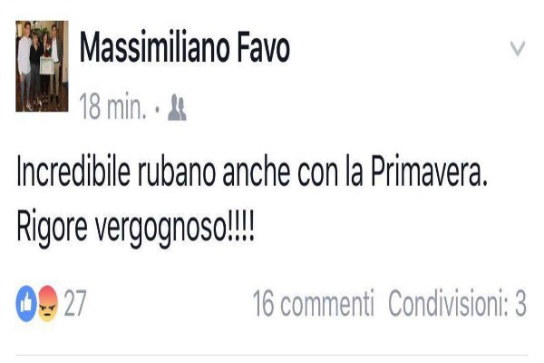 La sconfitta del Palermo Primavera in finale contro la Juventus non è andata giù a tanti. I bianconeri, infatti, si imposti per 3-2 nei minuti finali di gioco grazie ad un calcio rigore concesso dall’arbitro Valeri. Tra coloro che contestano il successo dei ragazzi di Fabio Grosso c’è anche l’ex rosanero Massimiliano Favo, che attraverso il proprio profilo Facebook ha commentato così: «Incredibile, rubano anche con la Primavera. Rigore vergognoso!».